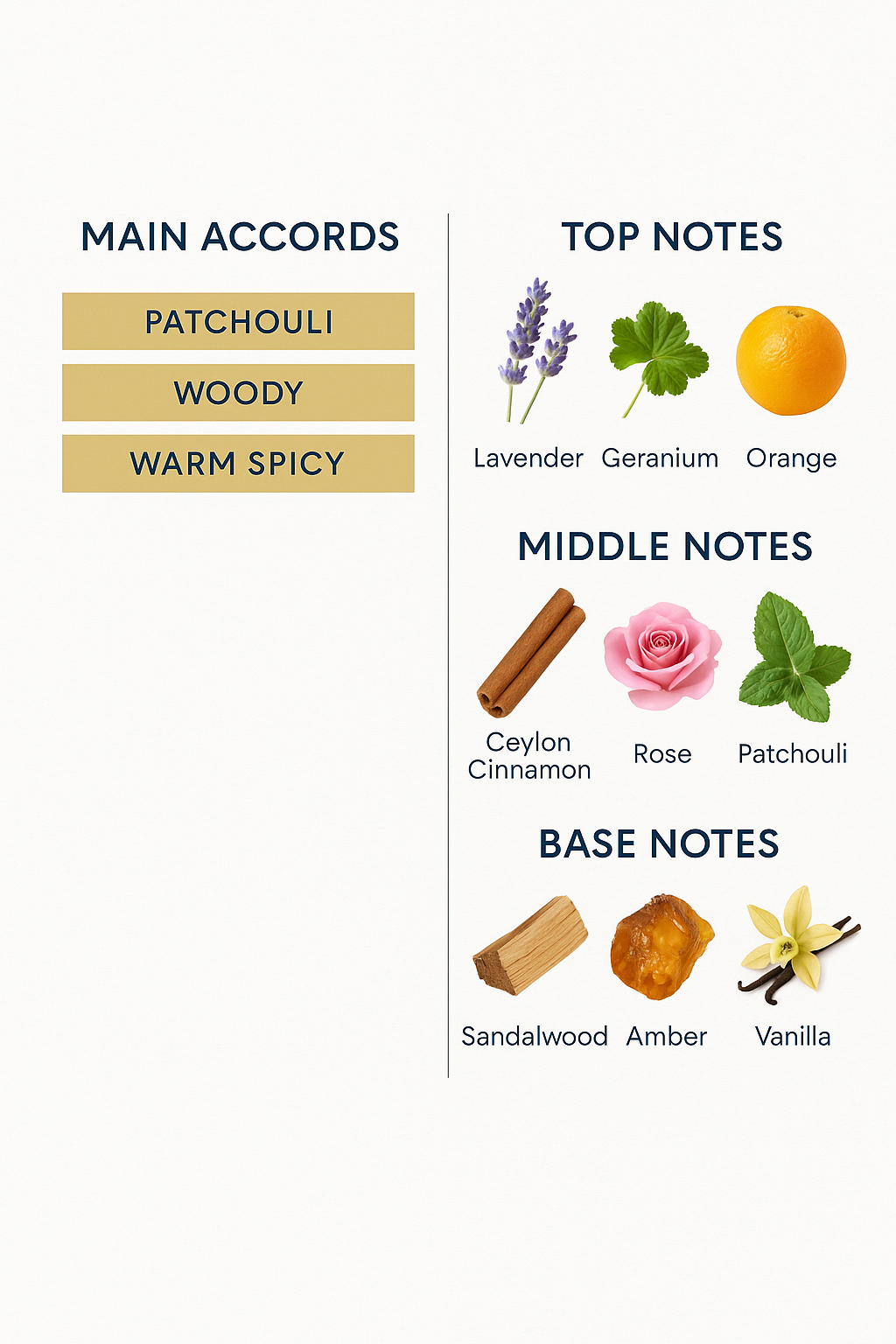 A unique fragrance: blending warm oriental notes and distinctive woody scents with a touch of spices.