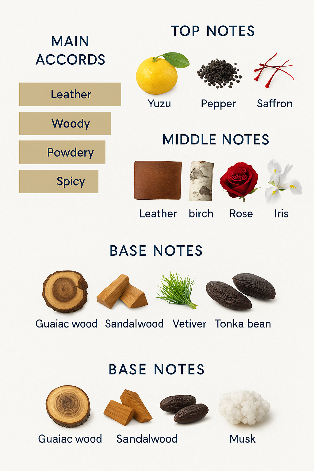 Base notes: Guaiac wood, sandalwood, vetiver, tonka bean, musk