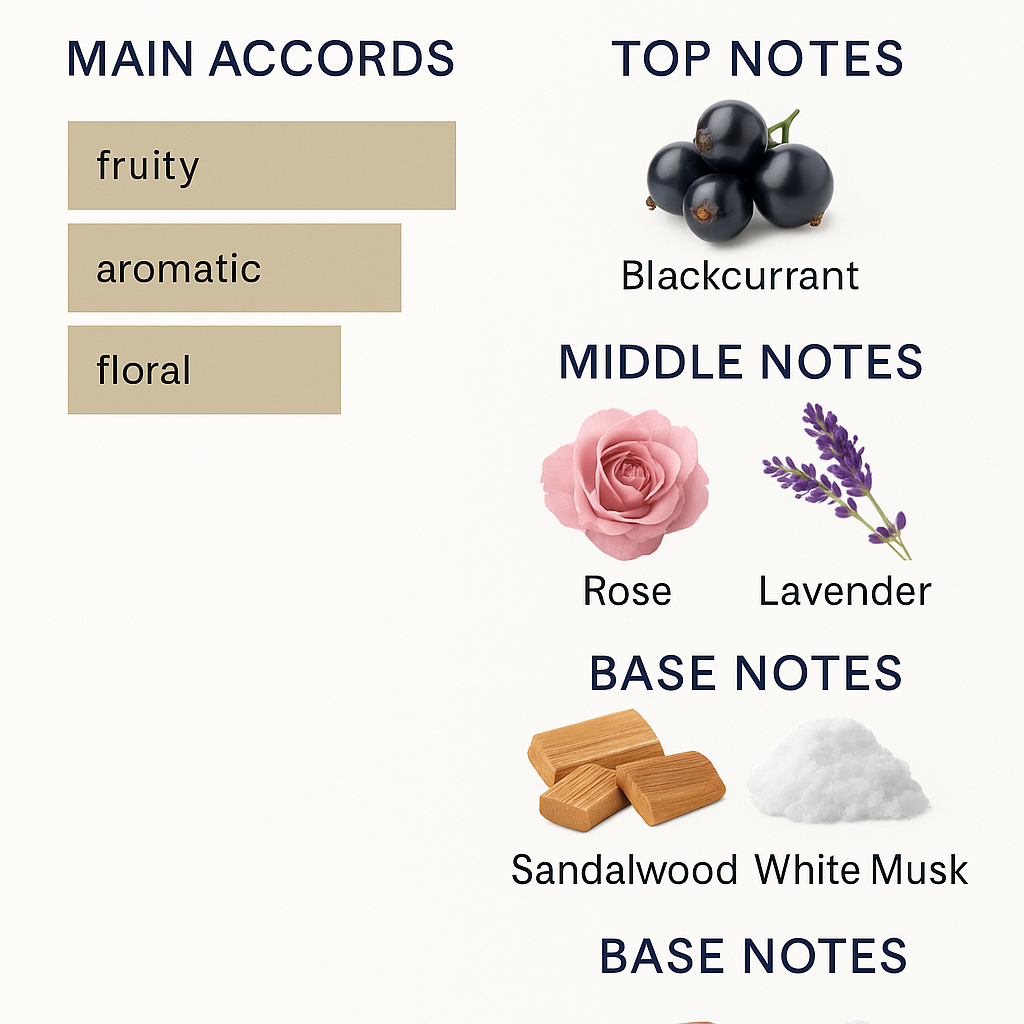 Warm notes of blackcurrant, patchouli and sage blend in perfect harmony with rose and lavender in the heart of the fragrance.