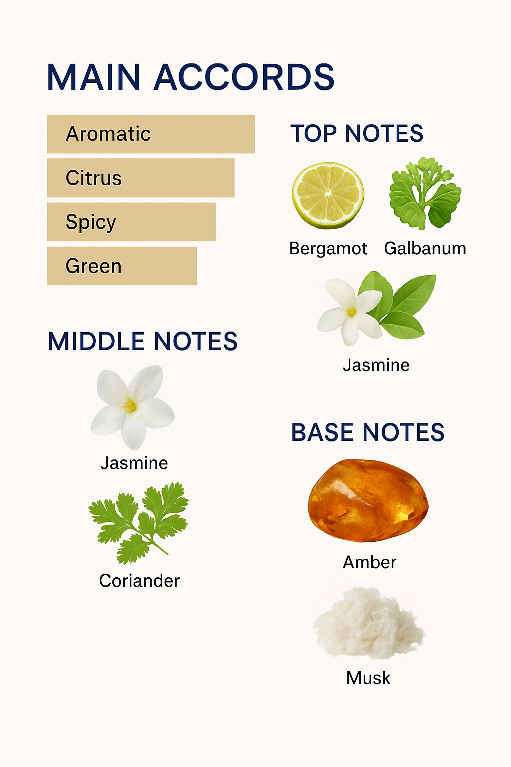 A unique blend of notes of bergamot, galbanum, green leaves, jasmine, coriander, amber and musk.