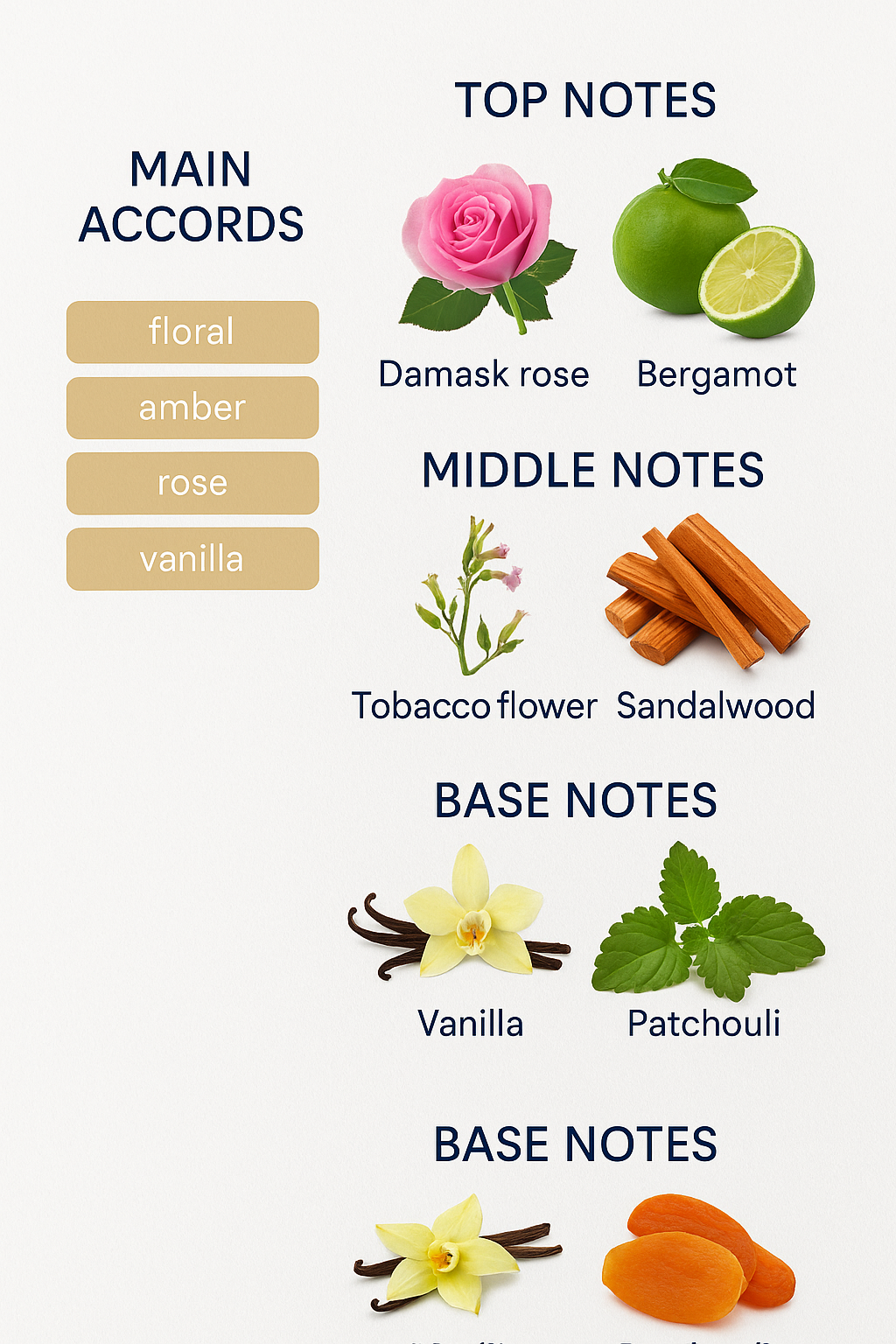 Top Notes: The fragrance opens with enchanting notes of Damask rose, blended with refreshing notes of bergamot, creating a unique and attractive blend.