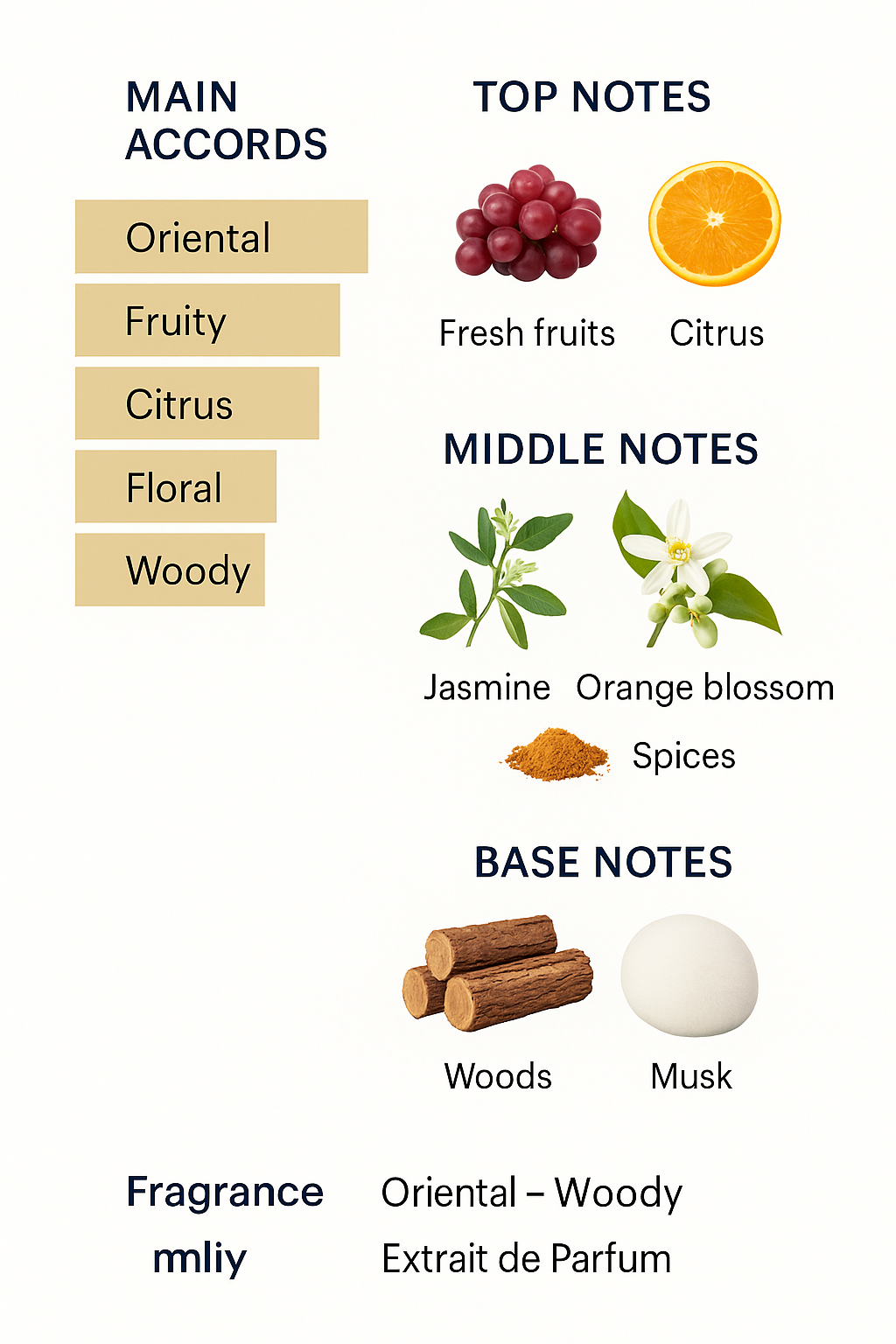 Base: The base consists of warm woods and musk, giving the fragrance long-lasting stability and depth. These scents contribute to a sense of luxury and confidence.