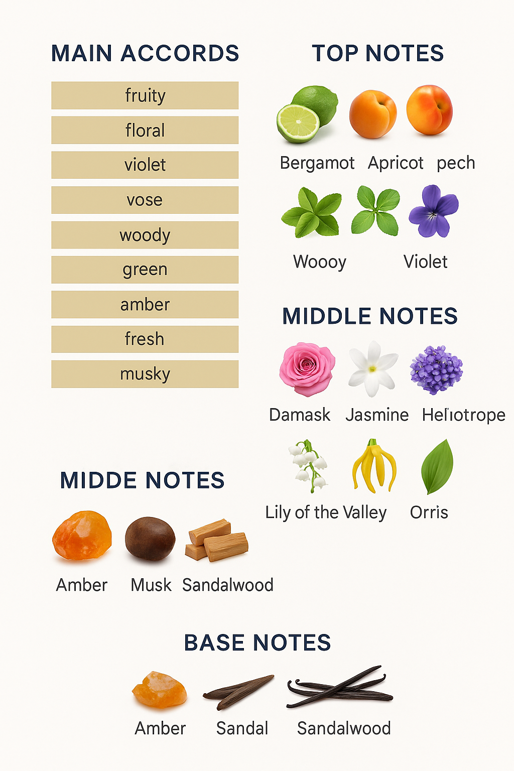 Top notes are fruity, with bergamot, apricot, peach, green notes and violet.
