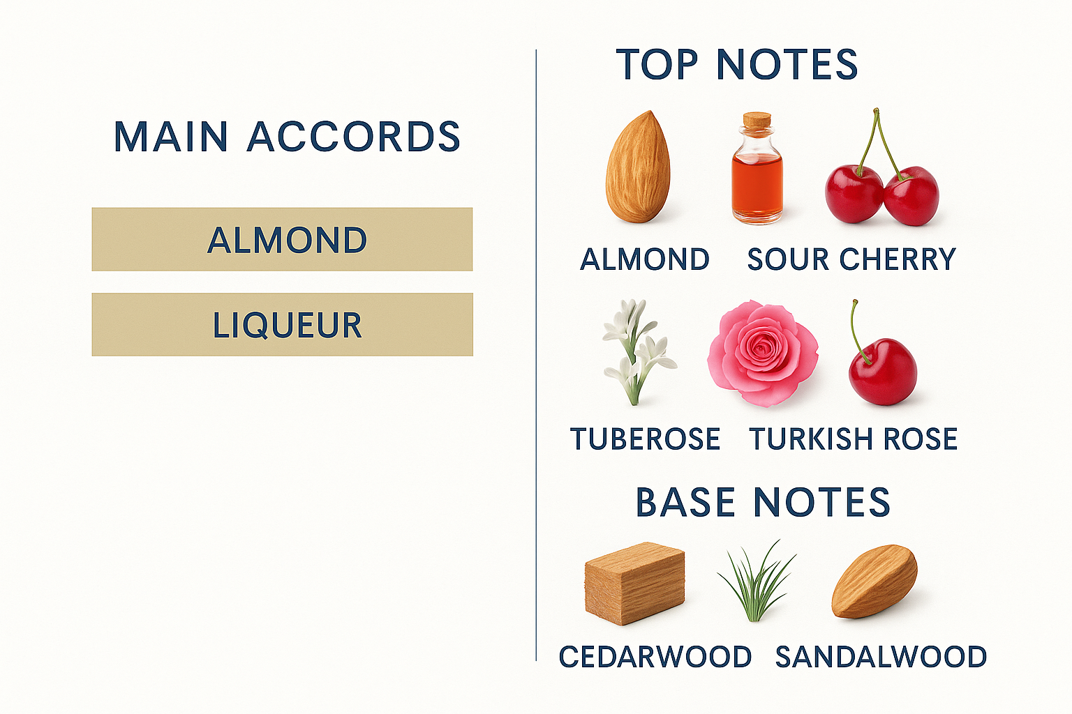 The fragrance shines with an exciting and attractive bouquet, starting with a boozy blend of almond mixed with liqueur and sour cherry. The heart follows with notes of tuberose, Turkish rose, and sour cherry. The base settles with cedarwood, vetiver, and sandalwood.