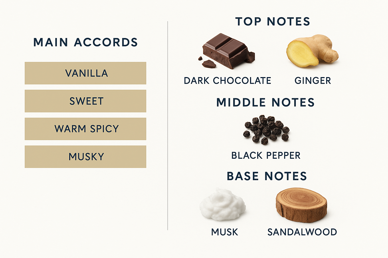 The scent includes dark chocolate, ginger, black pepper, sweetness, musk, and sandalwood.