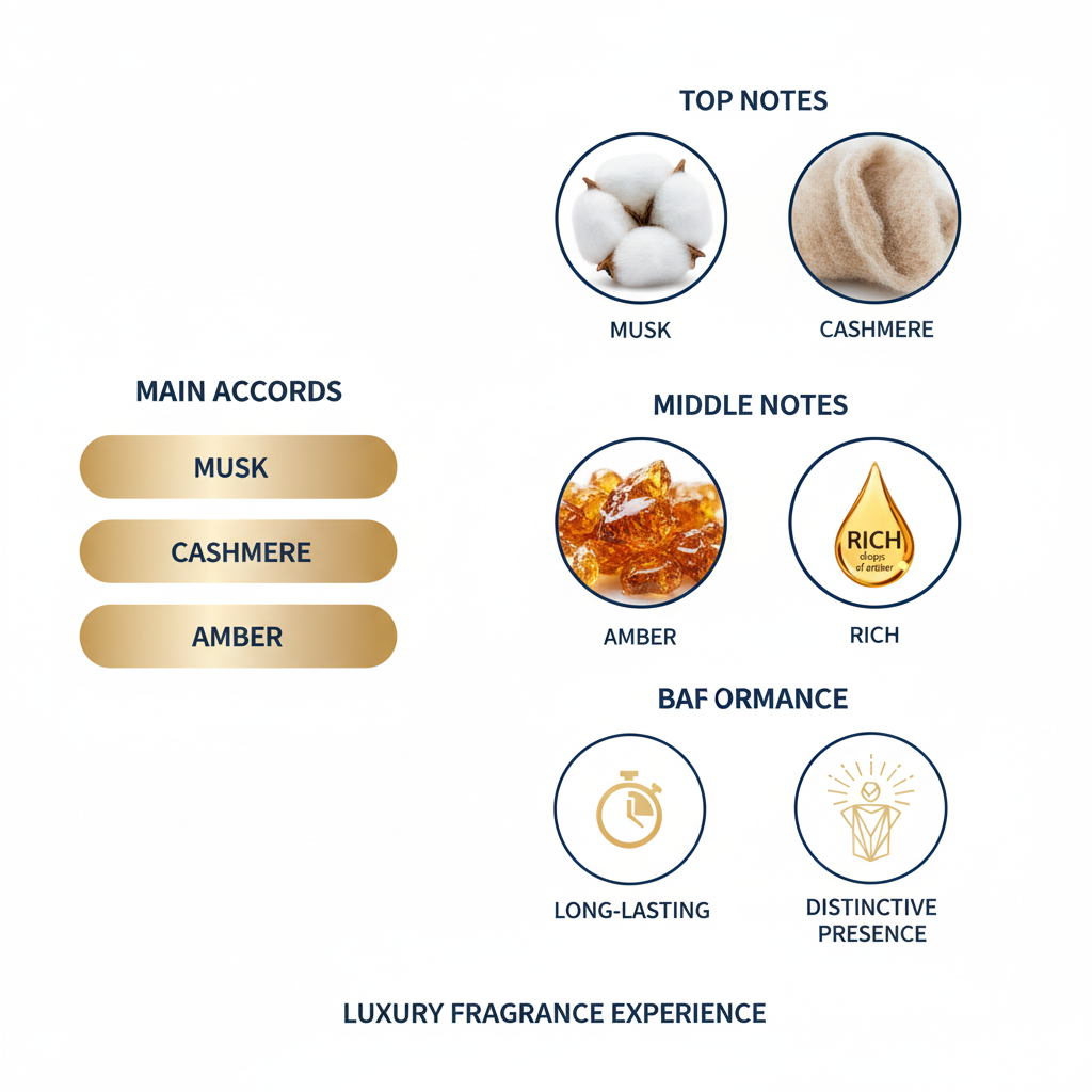 A unique and special fragrance experience that adds excitement and thrill to your life moments. With notes of cashmere and musk blended with rich drops of amber, this scent gives you an elegant and distinctive presence that captures attention and adds warmth to your standout style. The perfume has a strong concentration and long-lasting performance that stays with you until the end of the day.