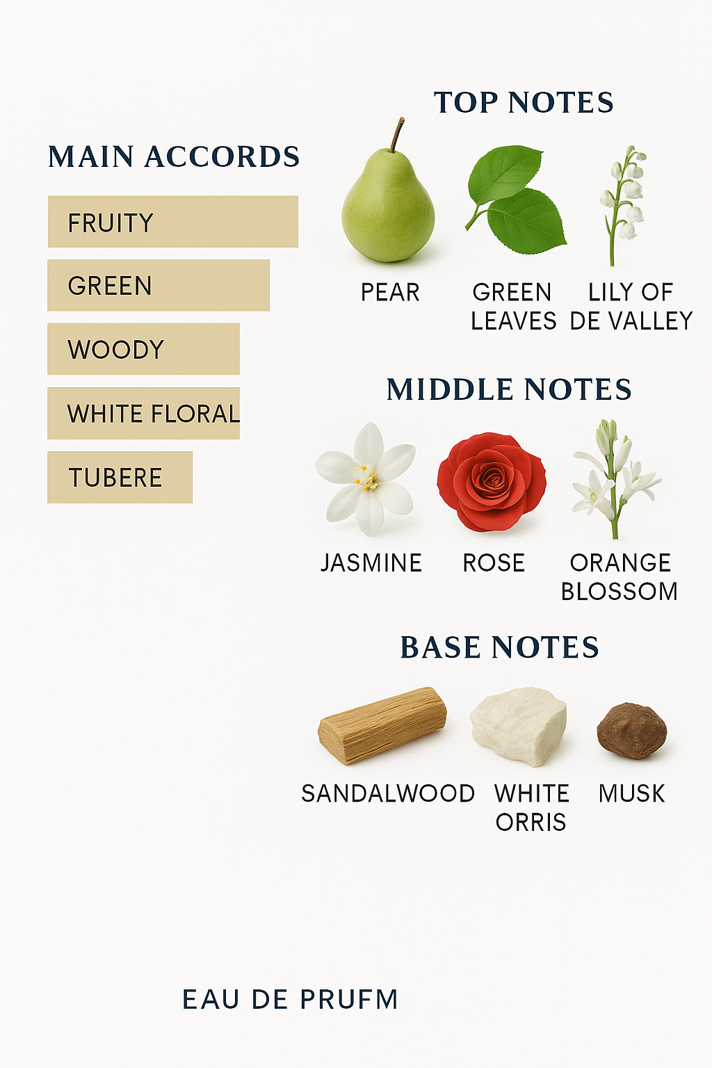 This Eau de Parfum reflects the natural elegance of woody and musky notes. It starts with a fresh breeze of pear, green leaves, and lily of the valley. Then, the heart of the fragrance reveals beautiful scents of jasmine, rose, orange blossom, and tuberose. As it settles, warm notes of sandalwood, white orris, and musk surround you.