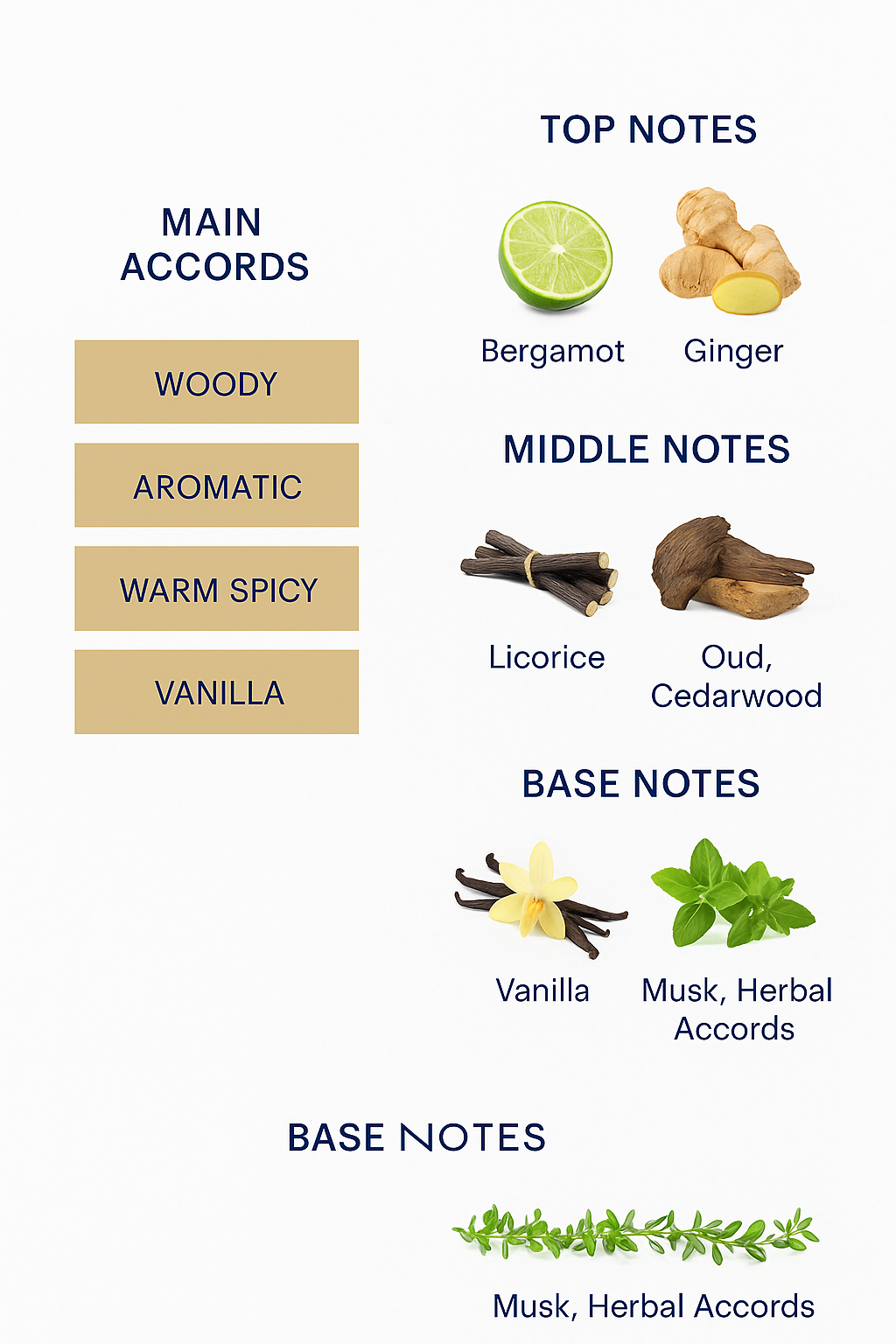 Heart Notes: A warm blend of licorice, oud, and cedarwood