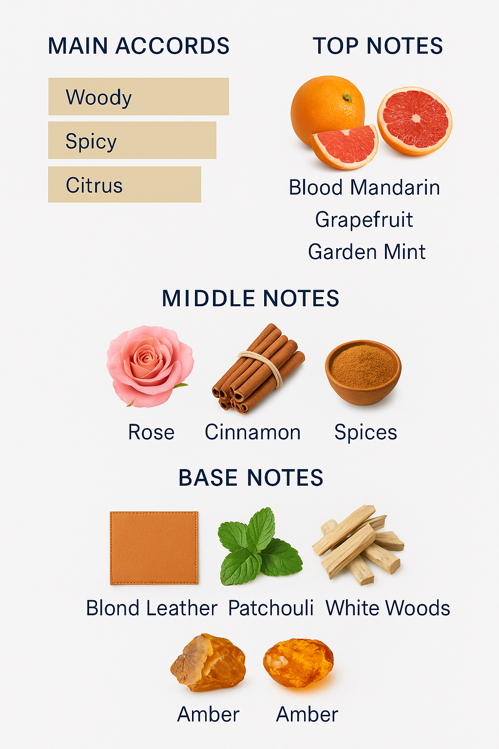 Base Notes: Blond Leather, Patchouli, White Woods, Amber