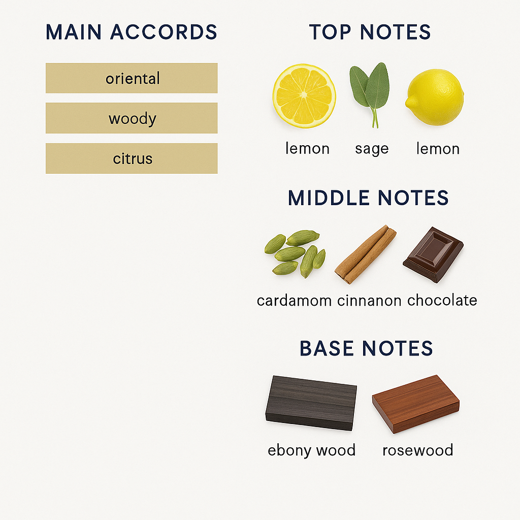 It opens with a top note blend of citrus, velvety sage, and lemon, followed by an elegant floral heart with cardamom, cinnamon, chocolate, and Tolu balsam.