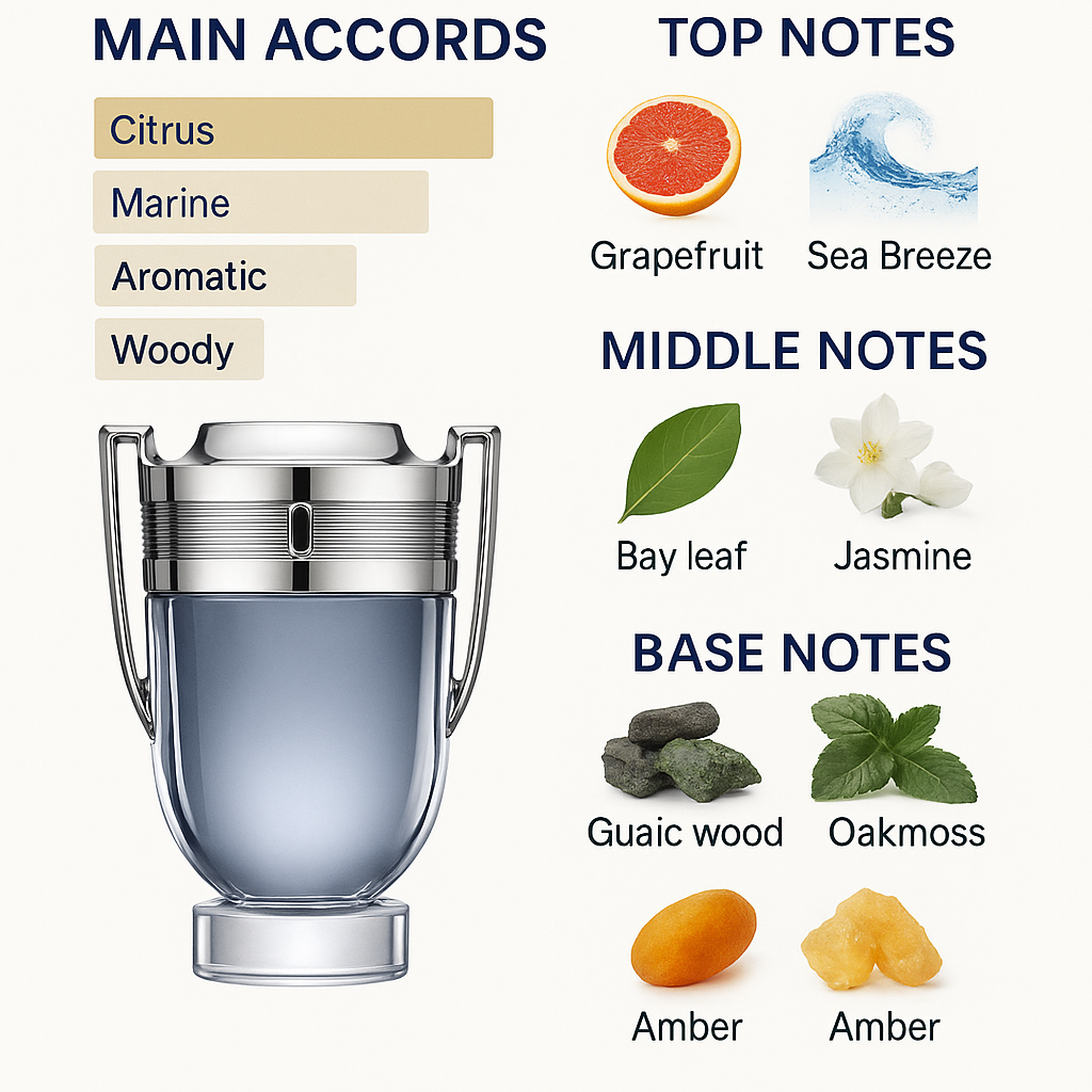 Grapefruit, Sea Breeze, Mandarin Orange, Bay Leaf, Jasmine, Guaiac Wood, Oakmoss, Patchouli, Amber