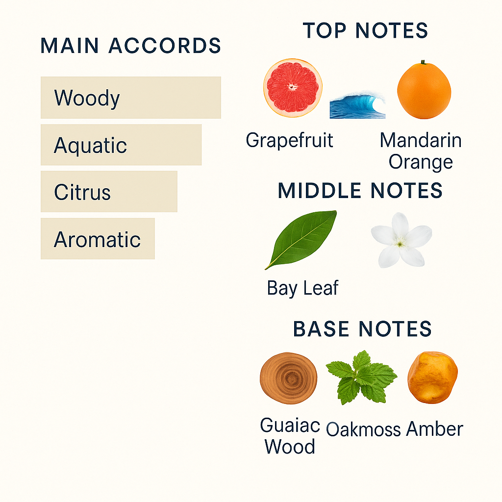 Notes: Grapefruit, Sea Breeze, Mandarin Orange, Bay Leaf, Jasmine, Guaiac Wood, Oakmoss, Patchouli, Amber