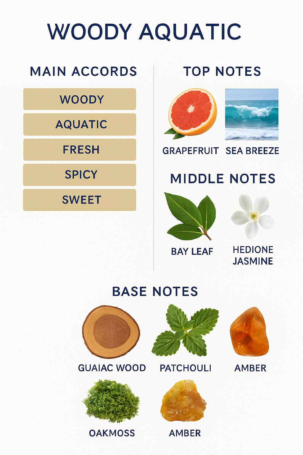 Base Notes: Guaiac Wood, Patchouli, Oakmoss, Amber