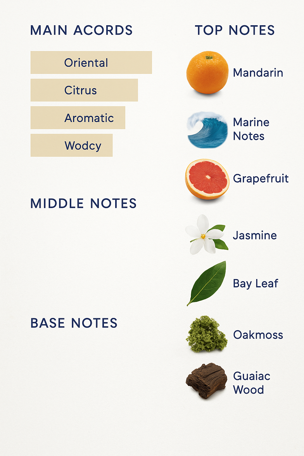 This fragrance radiates freshness and allure, opening with a vibrant blend of mandarin, marine notes, and grapefruit. The heart reveals an elegant mix of jasmine and bay leaf, while the base settles into a deep, grounding combination of patchouli, oakmoss, and guaiac wood.
