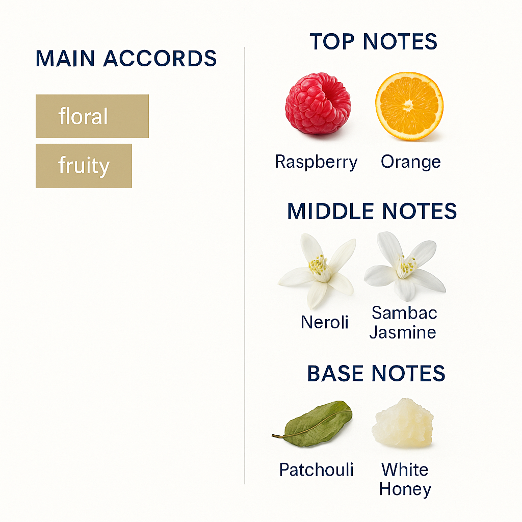 Notes: Raspberry, Neroli, Lemon, Jasmine, Orange Blossom, Gardenia, White Honey, Patchouli, Amber