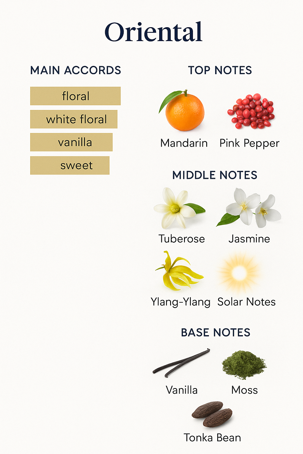followed by a heart of tuberose, ylang-ylang, jasmine, and solar notes.
