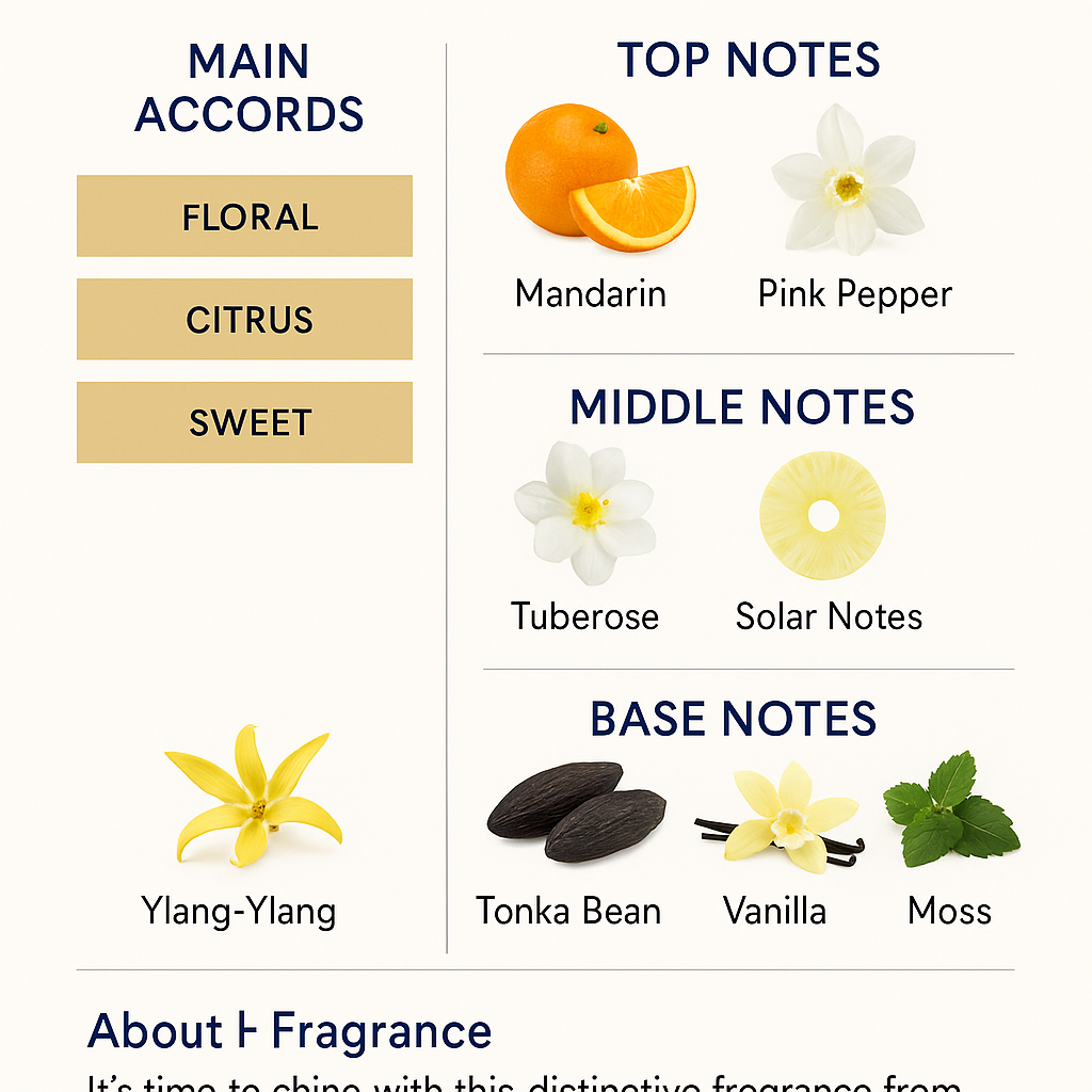 Mandarin, Pink Pepper, Tuberose, Jasmine, Solar Notes, Ylang-Ylang, Tonka Bean, Vanilla, Moss