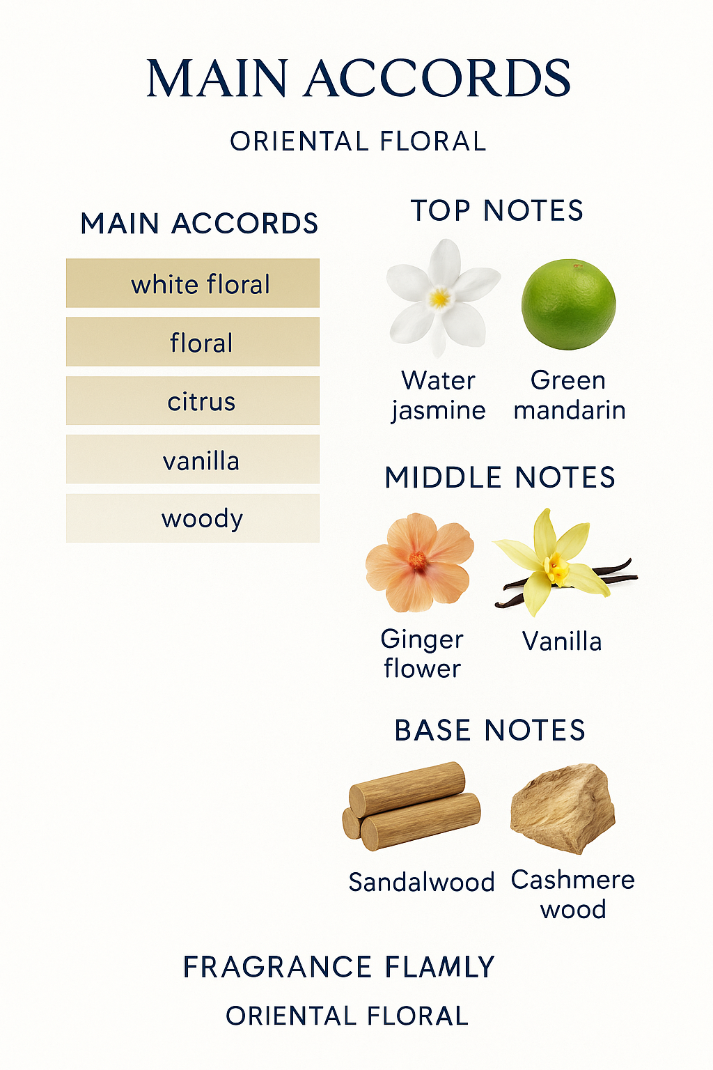 It opens with green mandarin and watery notes of jasmine, leading to a heart of ginger lily and vanilla, all resting on a warm base of sandalwood and cashmere wood.