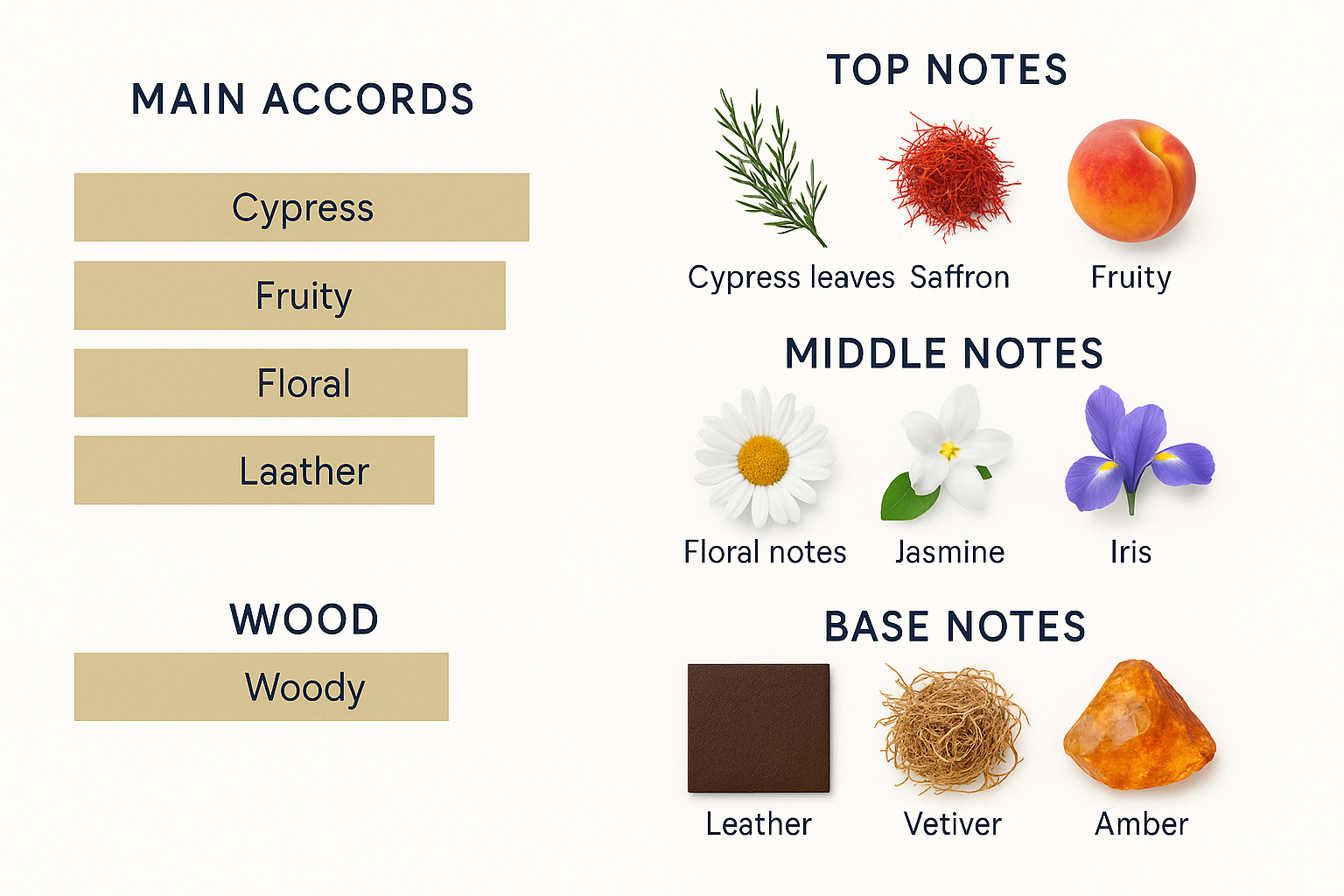 The top notes feature cypress leaves, saffron, and fruity accords.