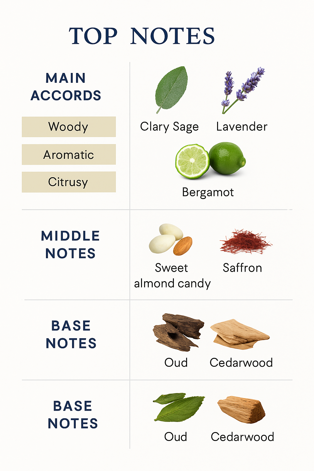 The base settles into a smooth and earthy finish with amberwood, musk, and oakmoss, giving the fragrance a refined and long-lasting trail.