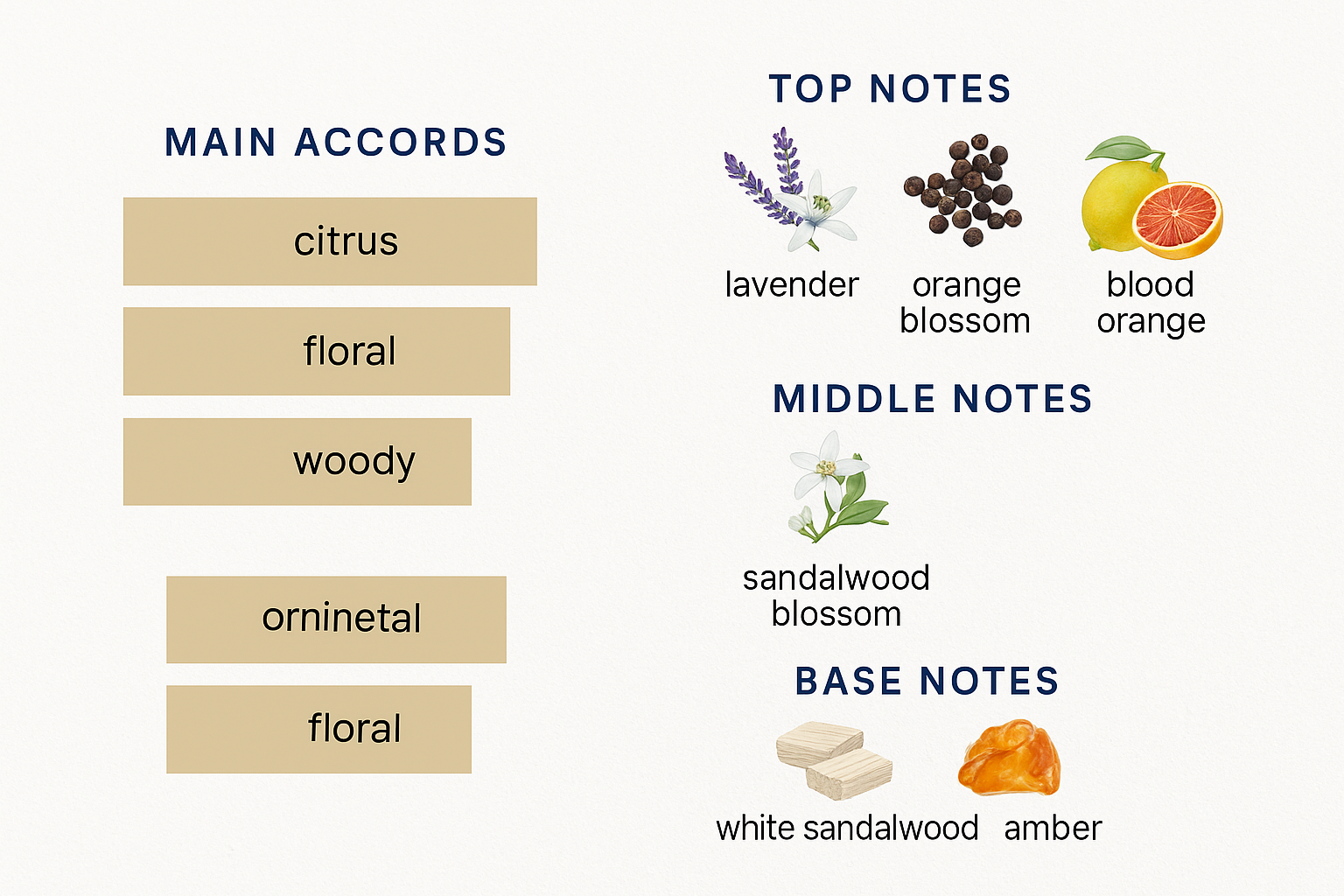 This fragrance is known for its unique composition recognized worldwide. Its elegant and refined blend of lavender flowers and orange blossom buds, combined with spices, black pepper, and blood orange, is the secret behind its irresistible charm.