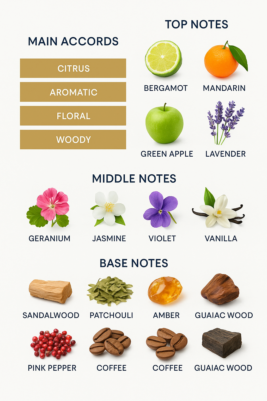 Base Notes: Sandalwood, Patchouli, Amber, Musk, Pink Pepper, Guaiac Wood, Coffee
