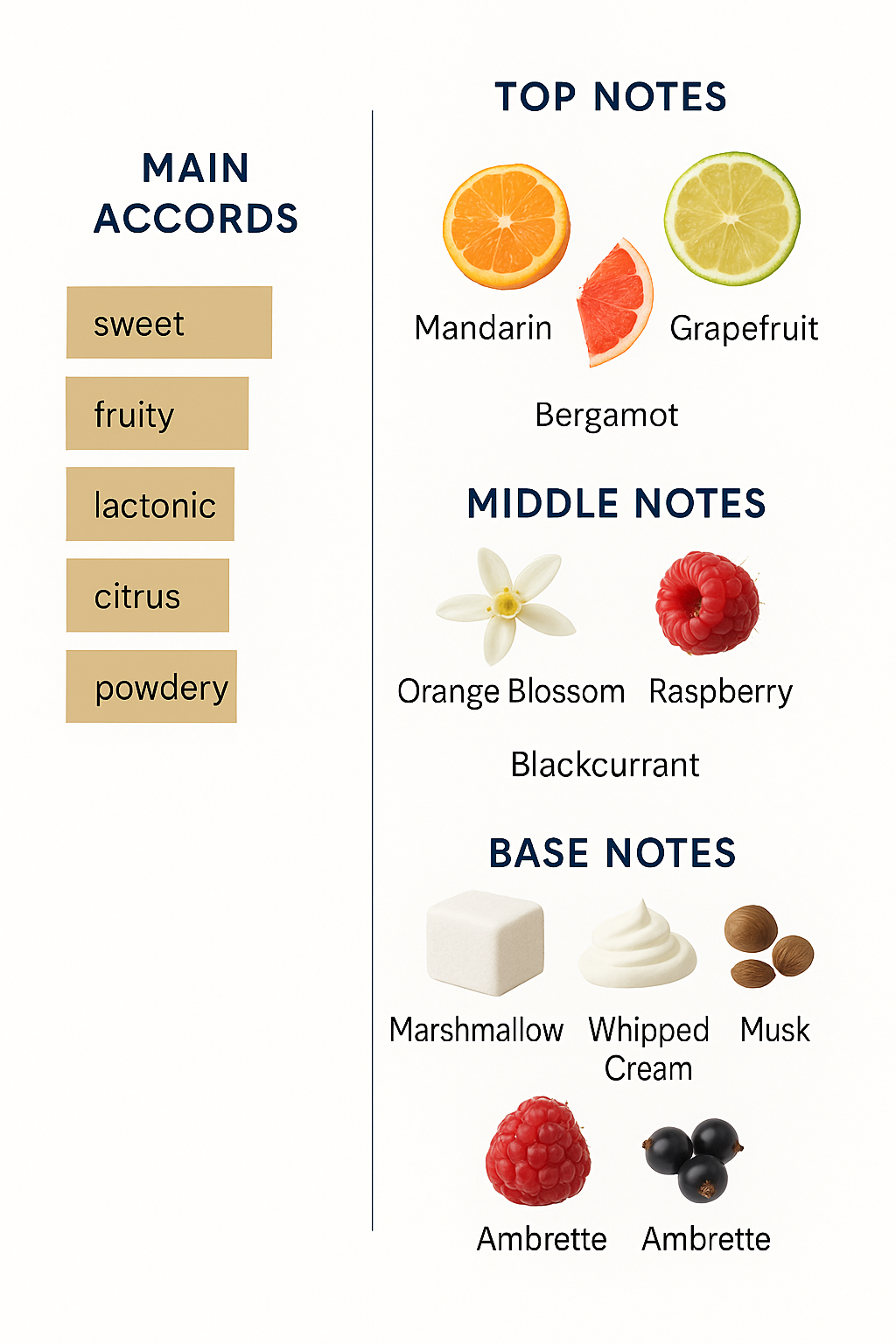Base Notes: Marshmallow, Whipped Cream, Musk, and Ambrette