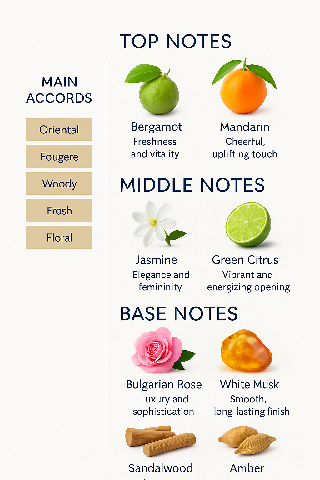 Oriental and Aromatic: Combines warm oriental notes with fresh, vibrant accords.