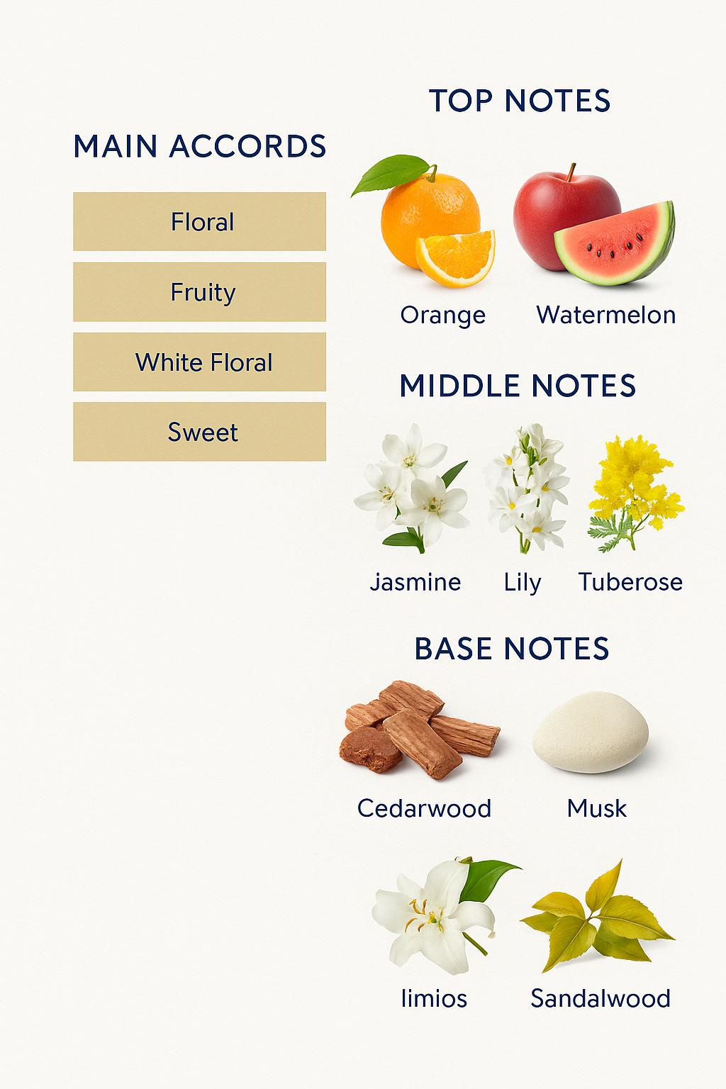 The scent then deepens into a harmonious floral heart of jasmine, lily, tuberose, and mimosa, creating a perfect balance of softness, beauty, and alluring femininity.