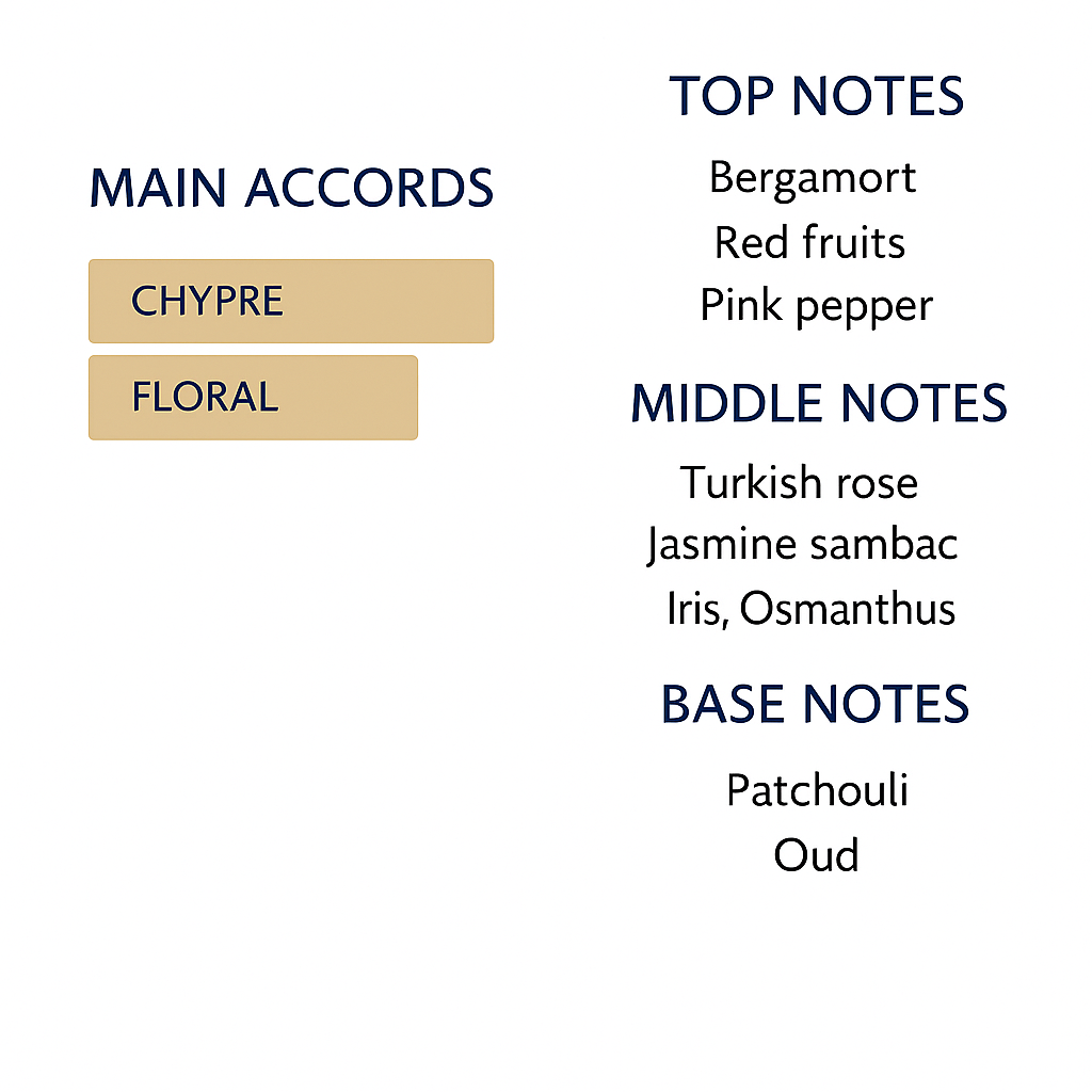 Heart notes: Turkish rose, jasmine sambac, iris, osmanthus