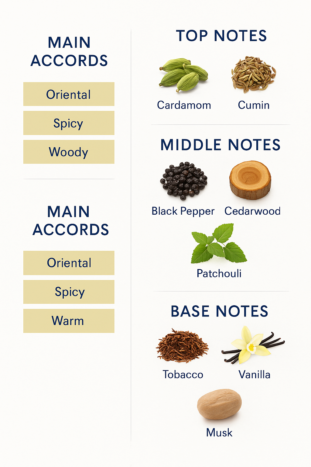 Base Notes: Tobacco, Vanilla, Musk – a smooth, warm, and sensual finish