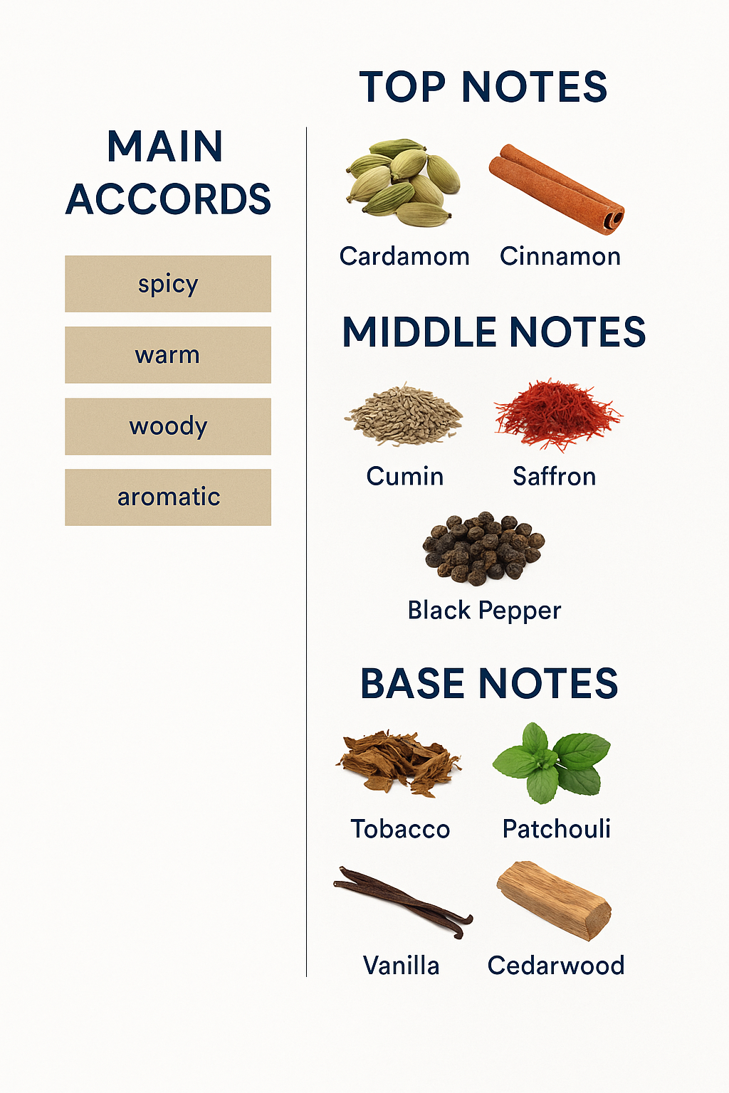 This scent portrays a confident, daring gentleman with a touch of mystery and charm — perfect for those who enjoy making a strong and unforgettable impression.