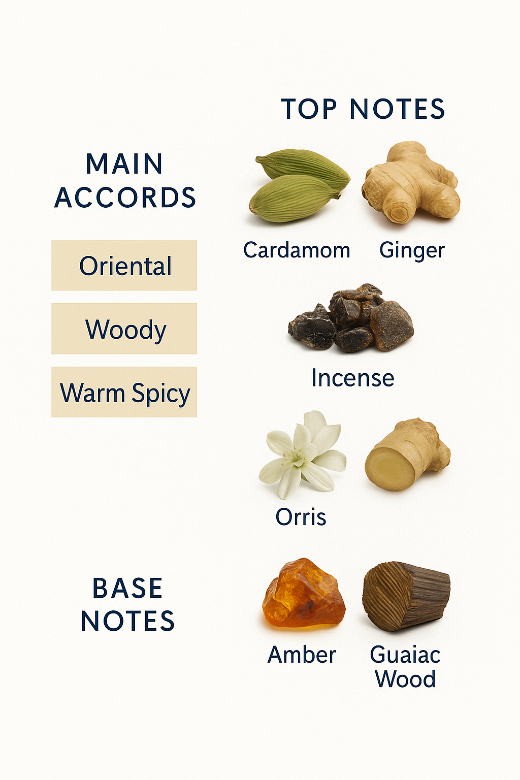 The scent opens with a radiant blend of cardamom and ginger, offering a warm yet invigorating start.