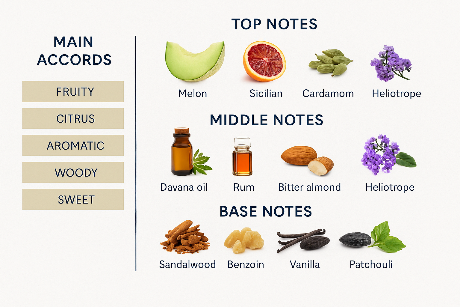 Heart notes: The middle reveals rich davana oil with a sweet woody character, alongside warm rum and attractive bitter almond, with hints of heliotrope that add a unique floral dimension.