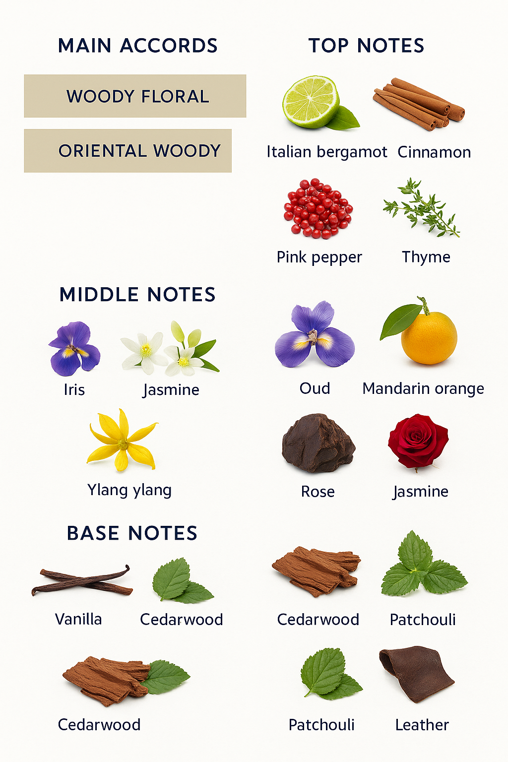 Top notes: Italian bergamot, cinnamon, and pink pepper.