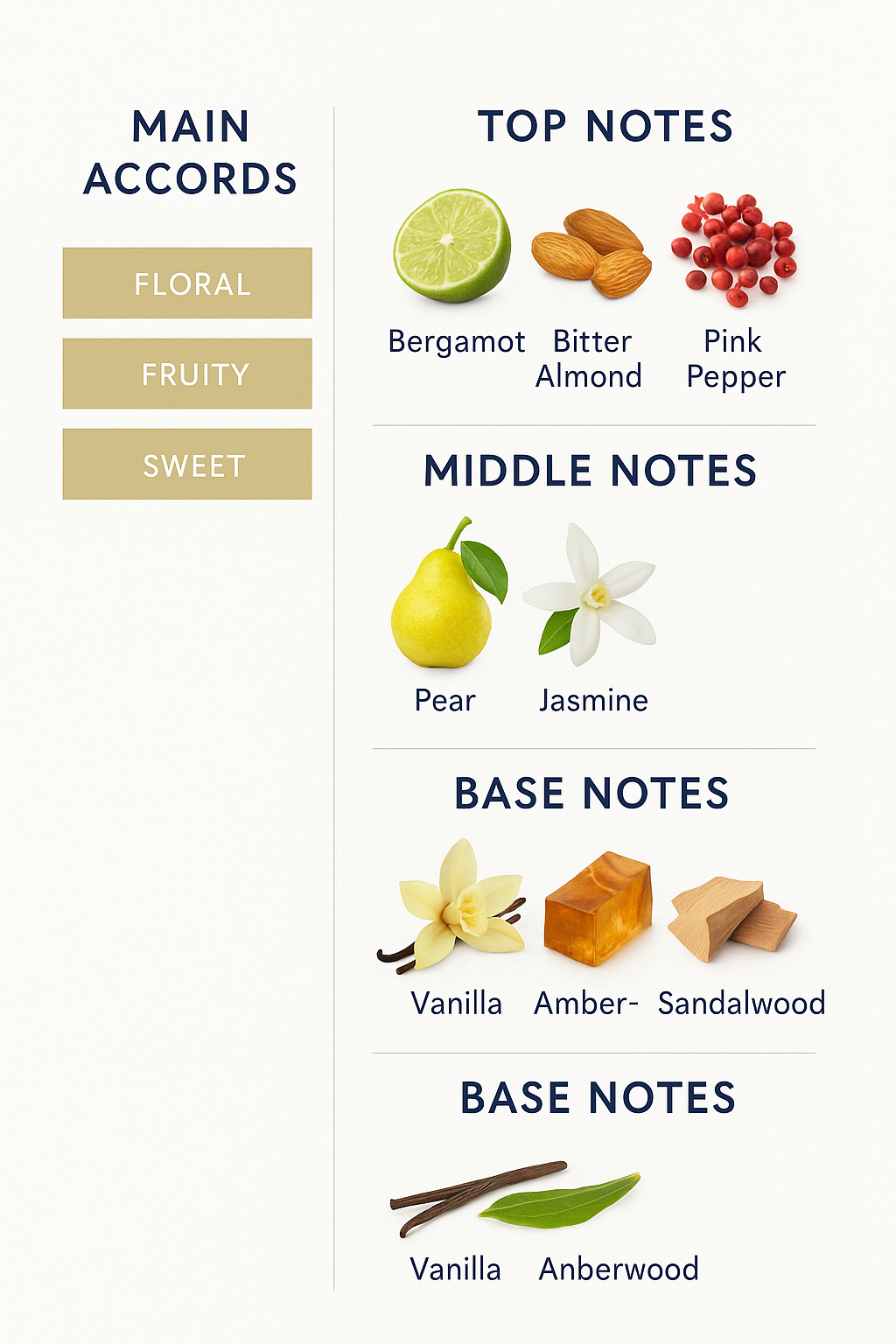 At its heart, you'll find the sweetness of pear blended with a soft hint of tonka bean and jasmine.