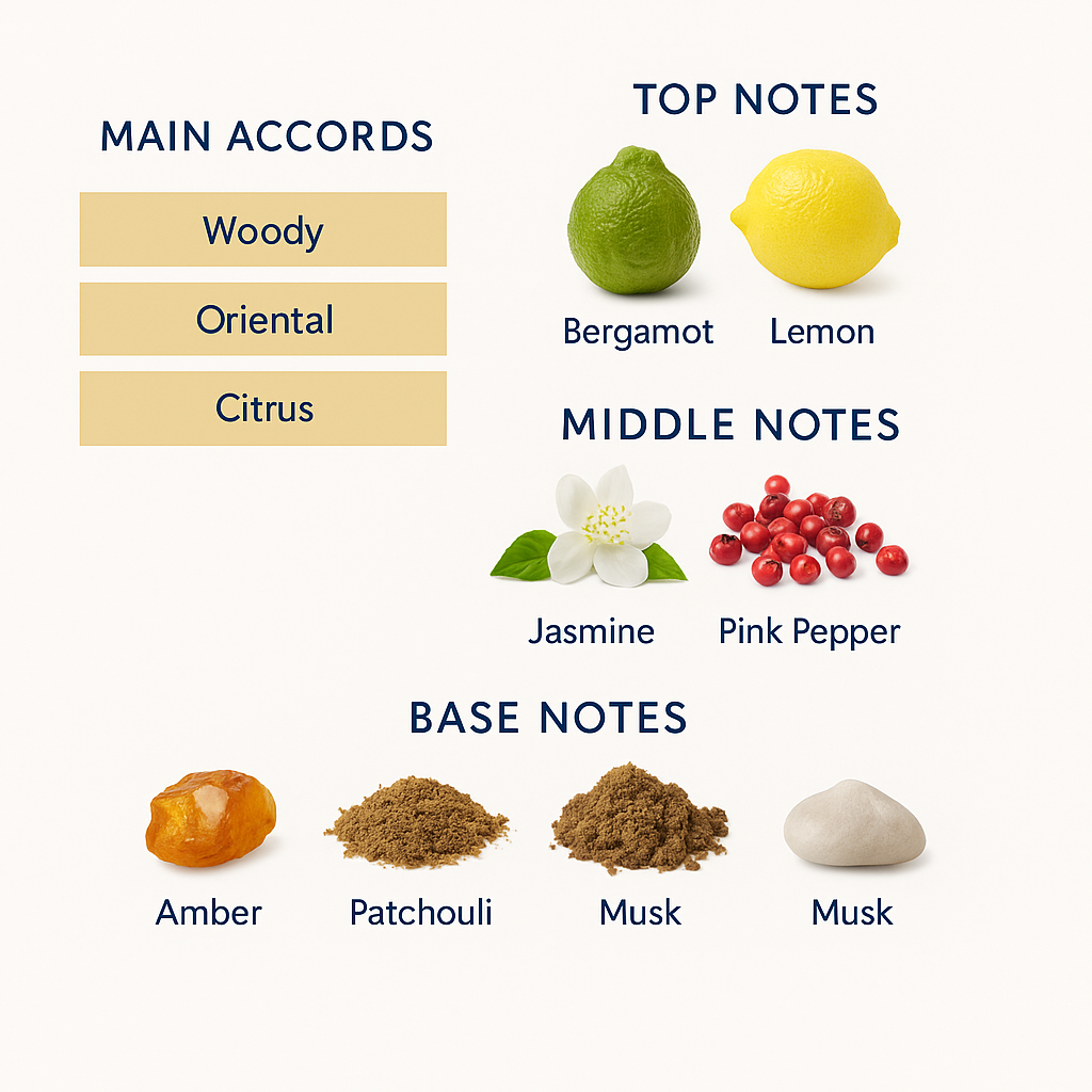 Base: Warm notes of amber and patchouli with musk add long-lasting stability and depth.