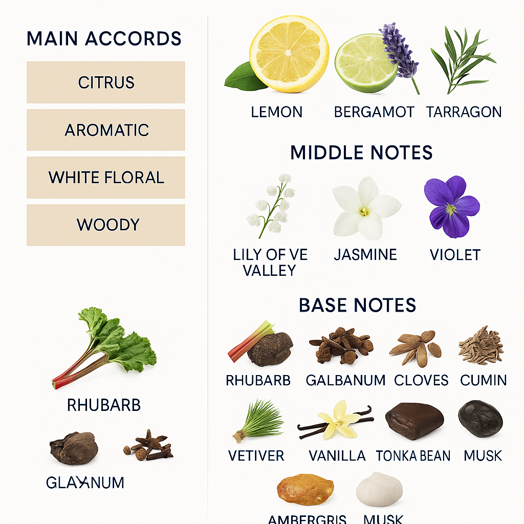 The fragrance's top notes feature a fresh and exciting blend of lemon, bergamot, lavender, and tarragon, creating a distinctive first impression.