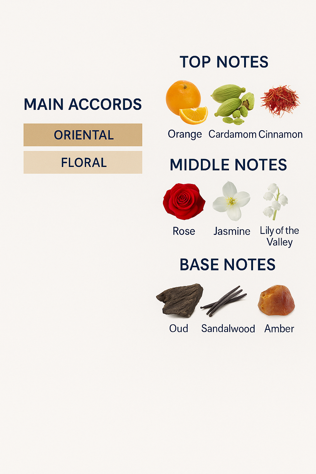 A unique blend of notes of oud, orange, mandarin, cardamom, cinnamon, saffron, rose, jasmine, lily of the valley, sandalwood, patchouli, white musk, vanilla and amber.
