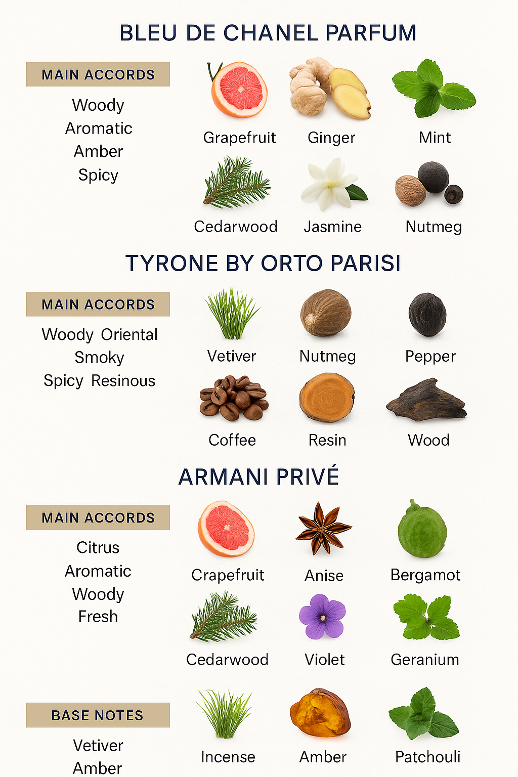 A set for men and women: Bleu Chanel Parfum, Teroni perfume, and Armani Prive perfume.