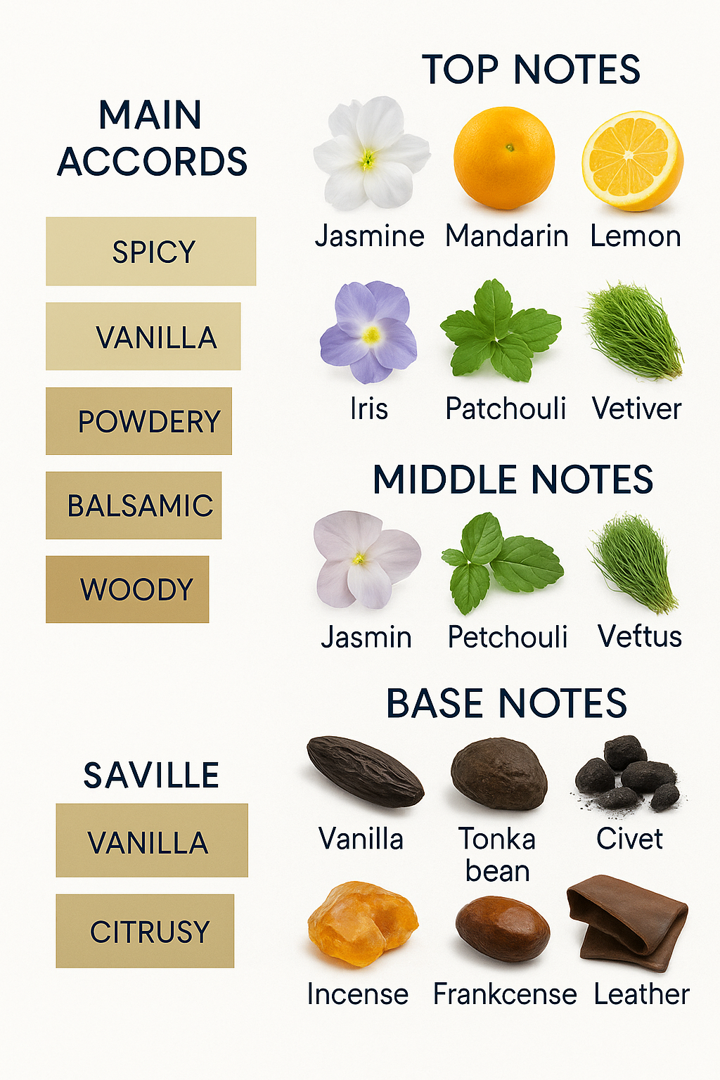 While the base notes are vanilla, tonka bean, civet, musk, incense, frankincense, sandalwood and leather.