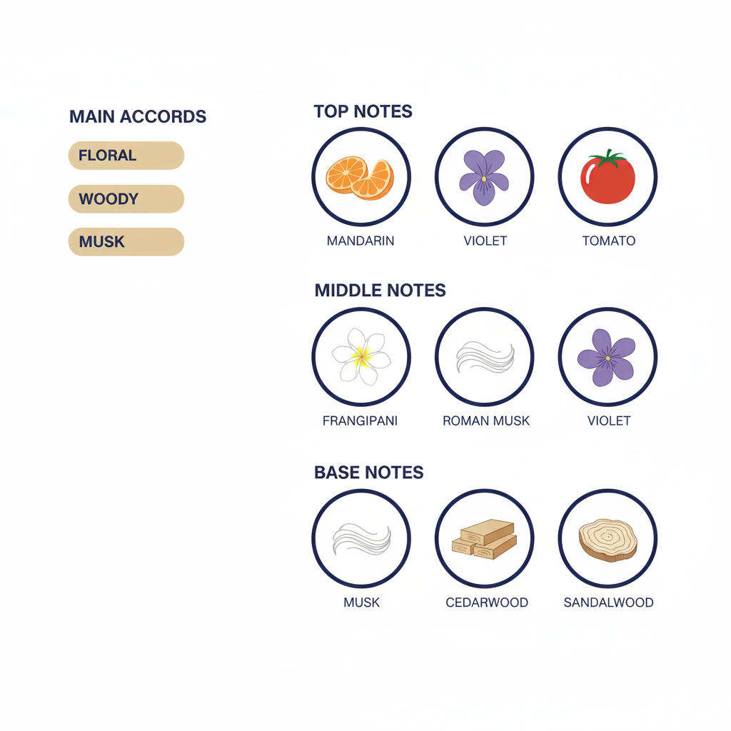 At first, this perfume surrounds you with a breeze full of mandarin, violet, and tomato scents. Then, the fragrance of frangipani, Roman musk, and violet rises, forming the vibrant heart of the perfume. As it settles, you’ll notice the lasting trail of musk, cedarwood, and sandalwood staying with you.