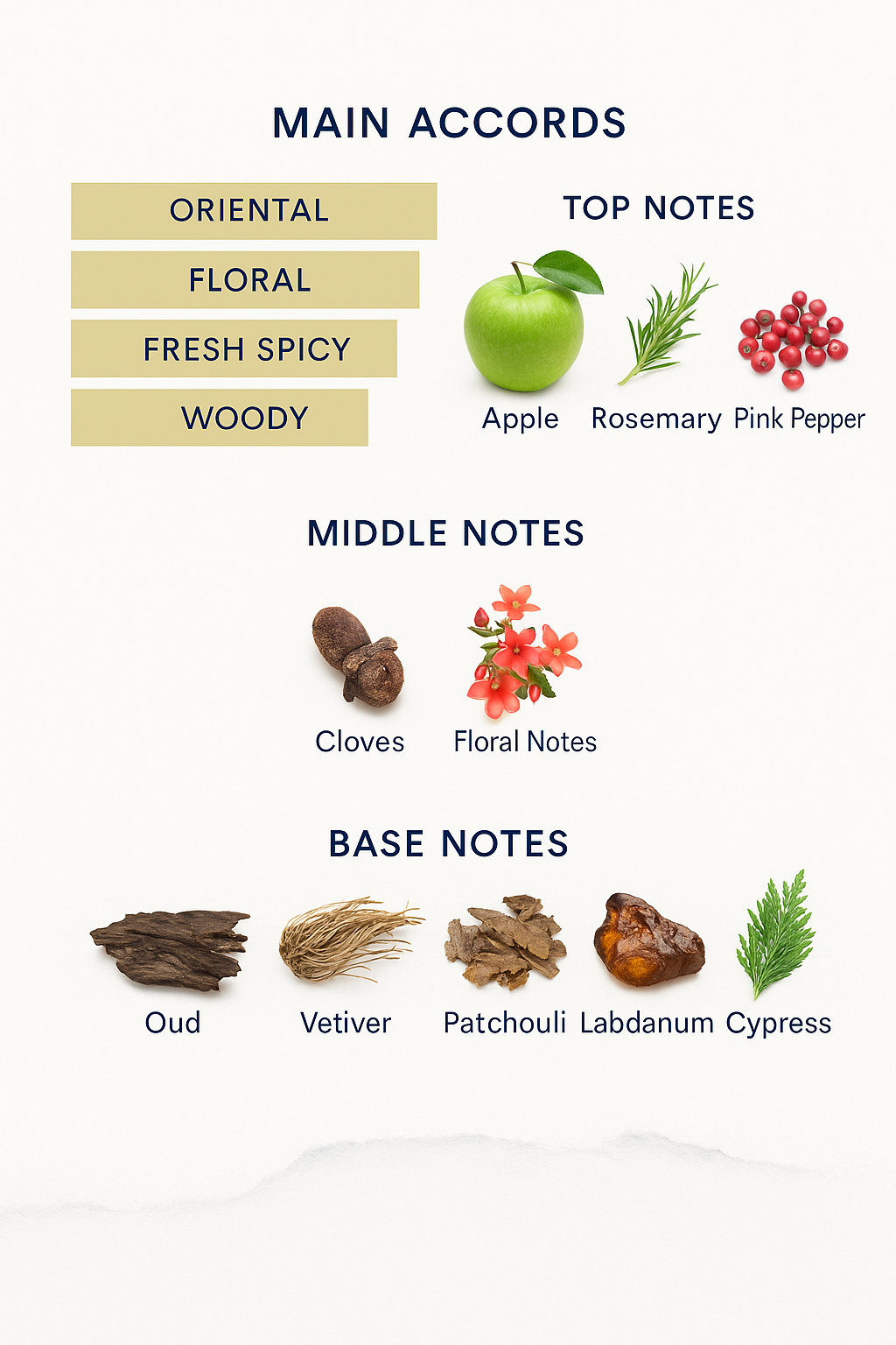 It combines notes of apple, rosemary, pink pepper, cloves, floral notes, oud, vetiver, patchouli, labdanum and cypress.