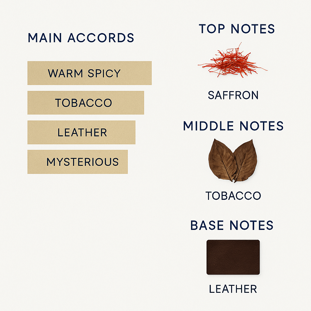 It adds a classic spirit and gives you a sense of majesty and luxury. The fragrance is decorated with bright threads of saffron that ignite the warmth of dark tobacco, creating a mysterious aromatic aura that draws attention.