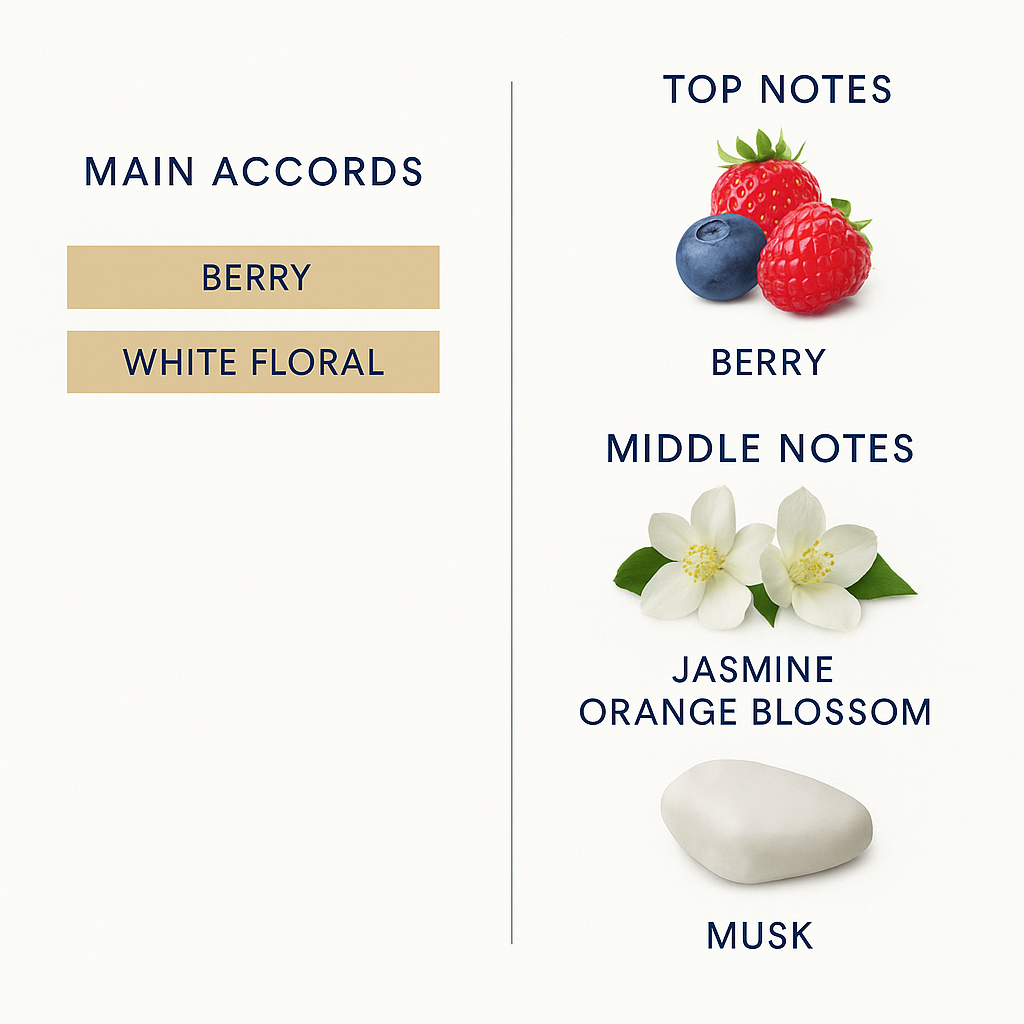 A luxurious musk base wrapped in a stunning blend of aromatic scents of jasmine and orange blossoms, combined with delicious berry notes. All contained in a stylish perfume bottle that adds a touch of beauty and sophisticated elegance you won’t be able to live without after the very first experience.