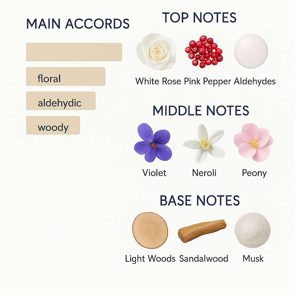 A floral aldehyde tester for the modern woman, characterized by its purity, simplicity, and light, refreshing touches. The fragrance opens with notes of white rose, pink pepper, and aldehydes, progressing to a heart of violet, neroli, and peony, and concludes with light woods, sandalwood, and musk