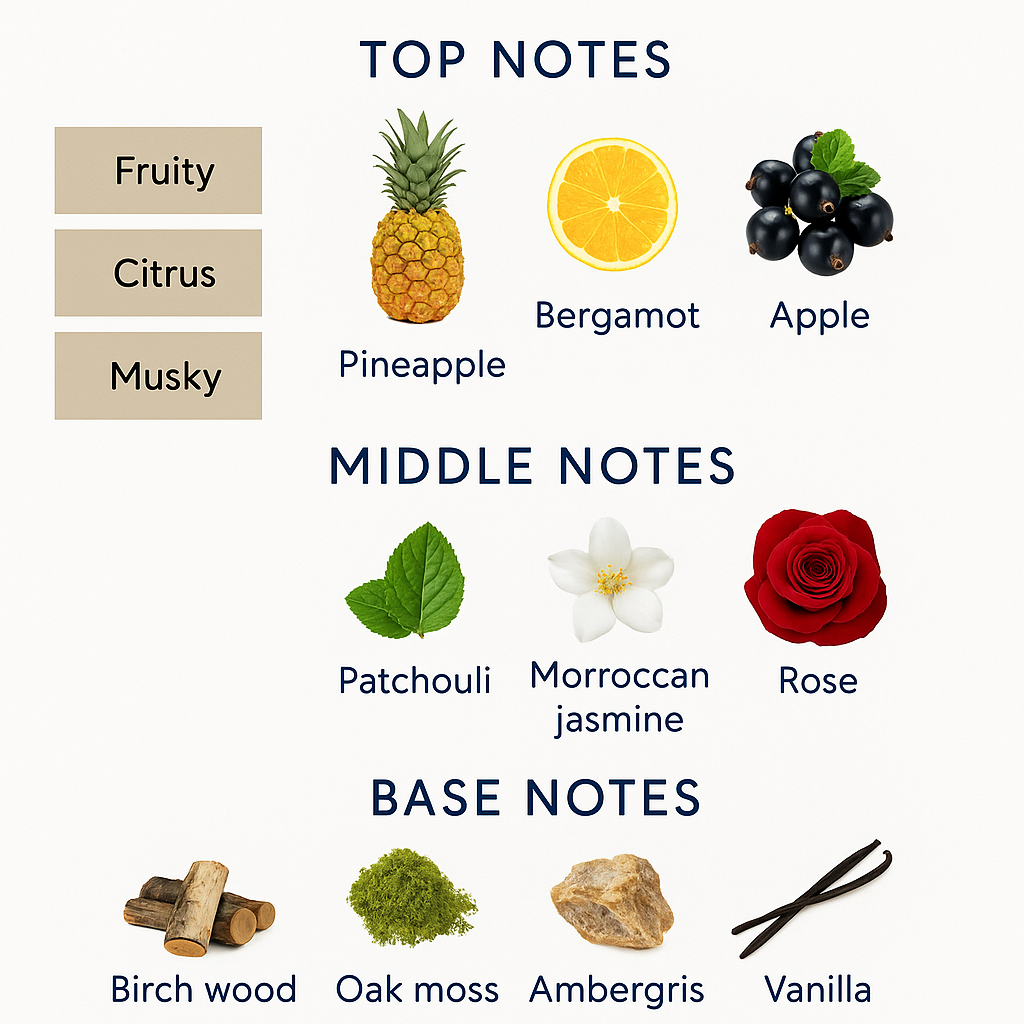 Key notes: Pineapple, bergamot, blackcurrant, apple, birch wood, patchouli, Moroccan jasmine, rose, musk, oak moss, ambergris, and vanilla. The fragrance line is chypre-fruity. About the fragrance: Creed Eau de Parfum is a luxurious scent that will leave a magical and attractive impact. Inspired by the drama of war, romance, and peace experienced by Emperor Napoleon, Aventus by Creed celebrates his strength and vision through its fragrant scent.