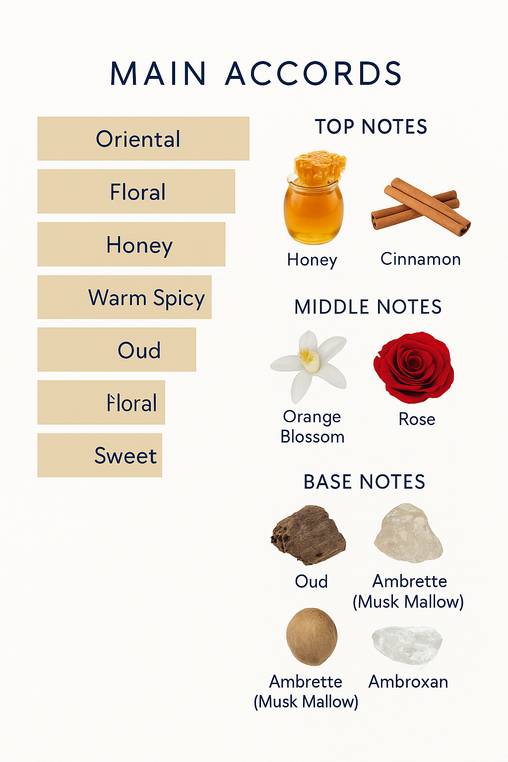 An oriental floral fragrance for both sexes. This is a new fragrance. Jacques Cavallier signed this fragrance. Top notes are honey and cinnamon. Middle notes are orange blossom, rose and jasmine. Base notes are oud, ambrette (musk mallow) and ambroxan.