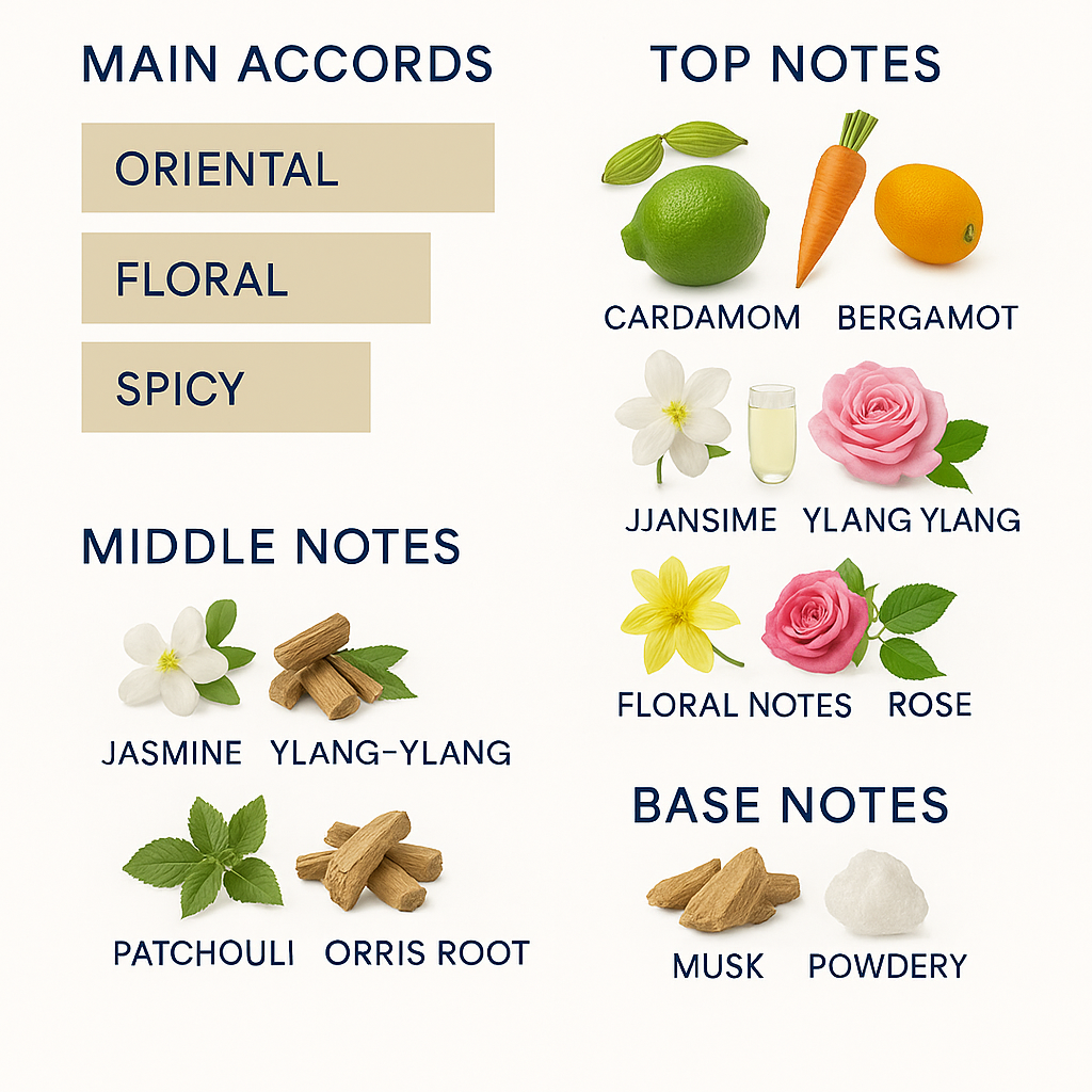 While the base of the composition concludes with sandalwood, patchouli, orris root, musk and powdery notes.