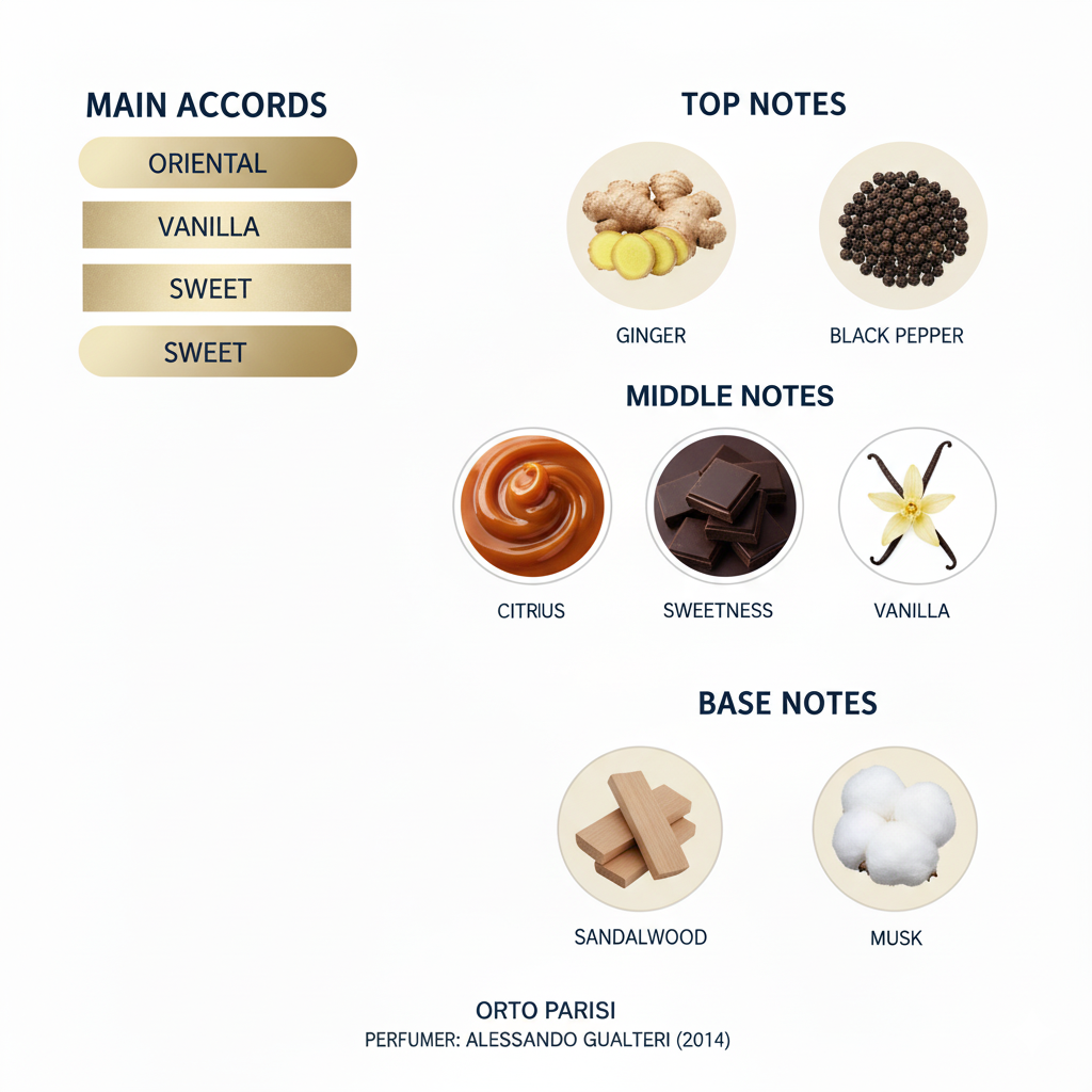The scent includes dark chocolate, ginger, black pepper, sweetness, musk, and sandalwood.